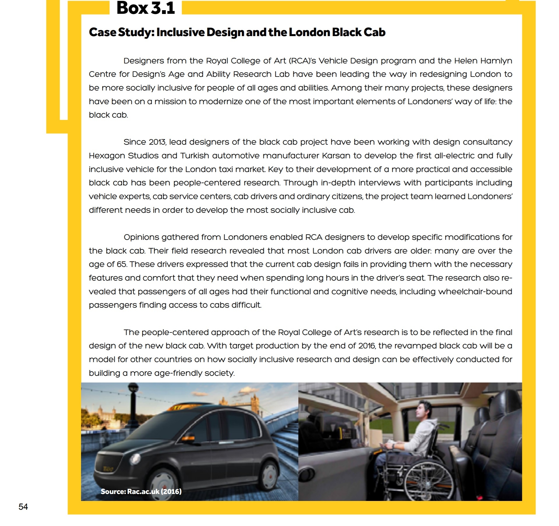 While I am skilled in academic writing, my preferred genre is mixing non-fiction with creative/narrative writing. In order to supplement the Our Hong Kong Foundation Aging Society Report’s more academic framework, I compiled case studies that focused on interesting, real world examples of how inclusive design has been successful. Page 54 of the Report highlights the case study I wrote on how the London black cabs have collaborated with local universities in developing universally accessible cabs. Entire case study written and proofread by me.