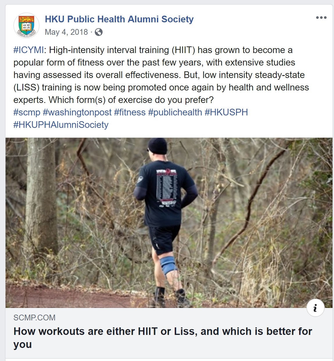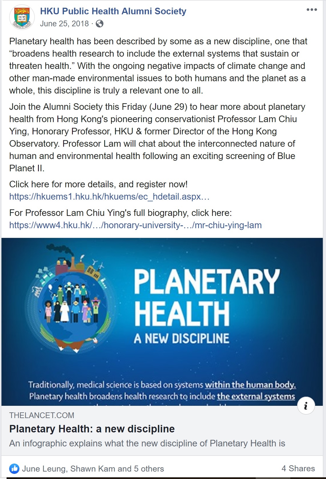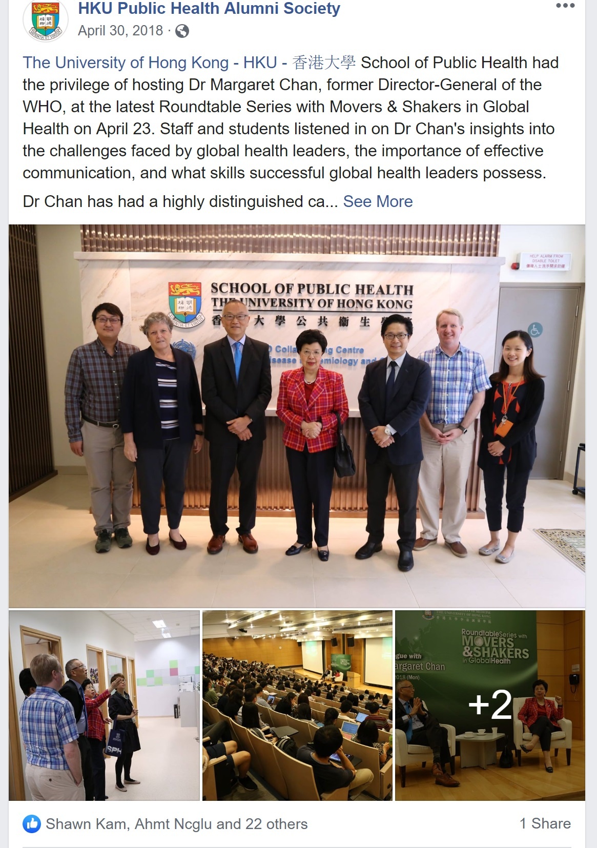 In 2017, while serving as Honorary Secretary of the University of Hong Kong’s Public Health Alumni Society, I helped to improve the social media outreach of the Society. This included becoming manager of the Society’s Facebook page, and launching the Society’s Instagram account.